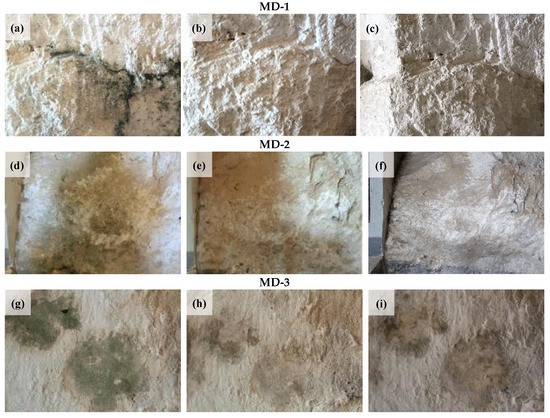 Two years later, all the surfaces subjected to both cleaning and protective treatments did not show any visual modification to suggest any kind of microbial colonization (Figure 7c,f,i).