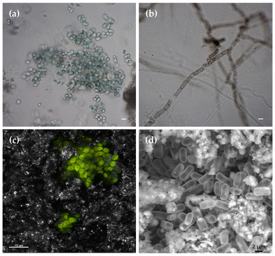 As expected, the microorganisms responsible for the colonization of the church Madonna dei Derelitti were quite different from those found in the church San Pietro Barisano due to the completely different environment. As shown in Figure 8, the patinas were formed by cyanobacteria belonging to the genus Chroococcus or Gloeocapsa (Figure 8a); fungi (Figure 8b); green microalgae belonging to the genus Muriella (Figure 8c); and diatoms, probably a species of Humidophila sp. (Figure 8d). Figures S2–S4 in the Supplementary Materials show some selected SEM images of reference, colonized and cleaned fragments collected inside the church along with EDS spectra. Table 2 reports the weight percentages of the main elements present in several small samples taken from both sides of the altar, i.e., MD-1 and MD-2.