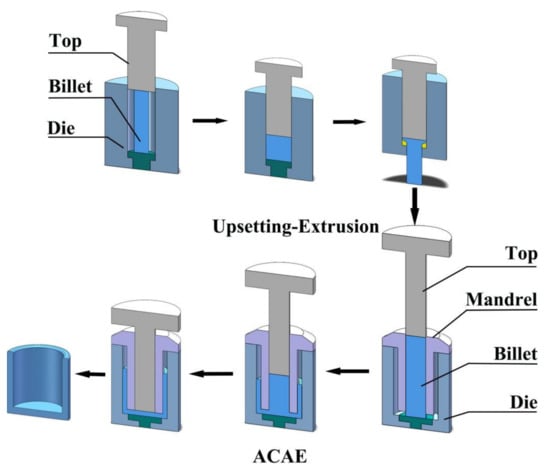 Lightweight and high-strength aluminum alloy cabin components can meet the demands of aerospace and weapons equipment for the integration and lightweight of the major load-bearing members [1,2,3]. The annular channel angular extrusion (ACAE) process is a kind of large plastic deformation process for preparing cabin shells in a short process with high efficiency, which enjoys a bright prospect in the application of industrial production. Evolving from the traditional backward extrusion (BE) process, the ACAE process can form the small-diameter billet into a large-diameter cabin and shell at one time, without complicated processes such as free upsetting and punching and reaming, with a large height-to-diameter ratio. Shatermashhadi et al. [4] proposed this new method and applied it to the preparation experiment of high-purity lead components. The results show that, compared with BE, the ACAE method reduced the extrusion force in the forming process, and the prepared components had a larger equivalent strain and a more uniform distribution along the height direction, so that the final components had a uniform microstructure and performance. This new back extrusion method was expected to be applied to the preparation of ultrafine crystal samples of aluminum, copper, and magnesium alloys. On the basis of this, S.H. Hosseini et al. [5] improved the geometric shape of the ACAE process deformation zone to obtain larger plastic strain and a more uniform distribution of strain. The improved method was applied to the preparation of industrial pure aluminum cup-shaped parts. This work focused on the microstructure evolution, the equivalent strain distribution, and the microhardness of the materials during deformation. The results show that: (1) Two shear zones provided high shear strain on the material, which led to significant grain refinement; and (2) The extrusion component had good uniformity of equivalent strain and hardness along the axial direction while obtaining a high equivalent strain and hardness. Zhao et al. [6,7] conducted a comparative study on the microstructure and properties of same-sized AZ80 magnesium alloy cabins (height: 210 mm; outer diameter: 200 mm: wall thickness: 16 mm), prepared by the ACAE method and the BE method, respectively, which showed that, compared with BE, the introduction of two strong shear deformations in the ACAE process helped refine the microstructure and significantly improved the deformation uniformity of the extruded components. This gave rise to more uniform mechanical properties along the height and thickness directions, but still exhibited anisotropy along the axial and circumferential directions. Gao et al. [8] applied the improved ACAE process for the preparation of a commercial 2A12 aluminum alloy cabin. After the T6 heat treatment, the axial UTS of the extruded cabin was increased to 476.1 Mpa, and the EL was 12.9%.