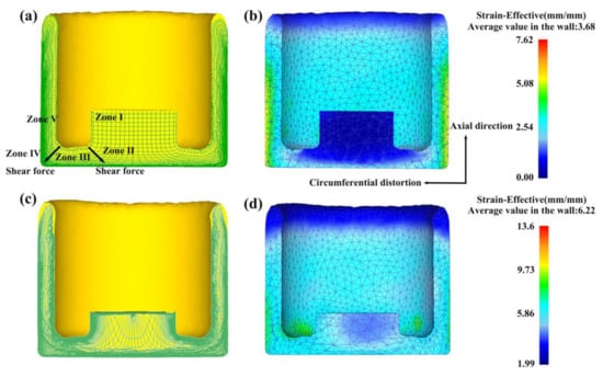 By comparing and observing the FE simulation results of the UE + ACAE-deformed member in Figure 3c, the mesh in Zone I was found to be in an elongated shape, which was due to the advanced upsetting extrusion. In the process of deformation, the cumulative strain of the material increased, and the mesh deformation became more and more obvious. The final expression was 5.04 for the effective strain value, which was caused by the upsetting extrusion in the undeformed zone (Zone Ⅰ) in Figure 3d, and it was 6.22 for the average effective strain value in the wall area (Zone Ⅴ). The UE provided the initial strain and the larger cumulative equivalent strain for the subsequent ACAE process.
