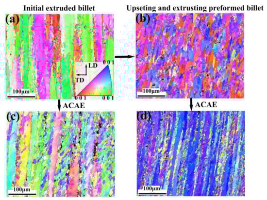 The inverse pole fig (IPF) of: (a) initial billet; (b) billet deformed by UE; (c) Zone Ⅴ of direct ACAE-forming cabin [7]; (d) Zone Ⅴ of UE + ACAE-forming cabin.