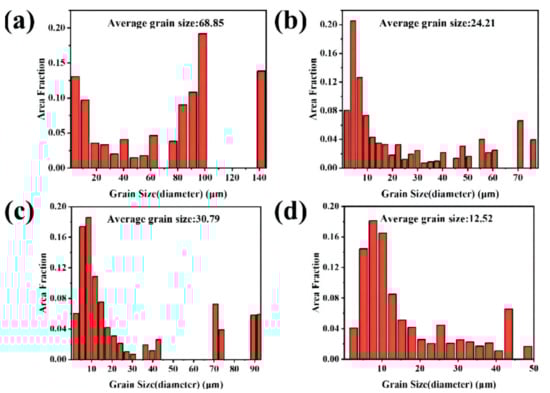 According to Figure 7, the average grain size of the blank was refined from 68.85 to 30.79 μm by the direct ACAE forming, but a small number of large ones with sizes of 90 μm still existed. After the UE, the average grain size of the billet was refined to 24.21 μm, and the maximum was reduced by half compared with the initial billet. The average grain size was further refined to 12.52 μm, and its distribution was more uniform after the UE + ACAE. This shows that the large grains can be broken significantly by upsetting extrusion, and that the grain size can be further reduced in the subsequent ACAE forming process.