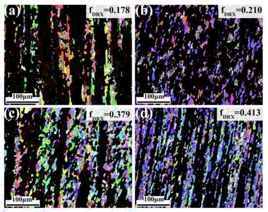 The grains with a Grain Orientation Spread (GOS) less than 2° were defined as DRXed grains and were displayed separately to obtain the dynamic recrystallized grain distribution, as shown in Figure 8. Meanwhile, the corresponding DRX ratio was calculated. As the initial billet was extruded, the dynamic recrystallization ratio was 17.8%. The DRX ratio (37.9%) was obtained by the direct ACAE forming. In contrast, the DRX ratio of the UE + ACAE Zone Ⅴ structure was as high as 41.3%, and the DRXed grain size was significantly smaller. This may be because the billet, after the upsetting extrusion, had a finer grain size and more grain boundaries, which provided a favorable region for recrystallization nucleation in the subsequent ACAE deformation process. Moreover, at the initial stage of thermal deformation, the second-phase particles could accelerate the DRX process through particle-stimulated nucleation (PSN) [18,19]. For the UE + ACAE-forming component, more dislocation pinning points and nucleation sites could be generated by thinning and dispersing the second-phase particles. At the same time, the large cumulative strain could store more deformation energy in the material, and it generated more dynamic recrystallized grains through grain boundary migration or subgrain rotation [15,16,17]. Moreover, due to the Zener resistance effect, the broken fine particles impeded the grain boundary movement and inhibited the growth of DRXed grains [18,20]. Therefore, the fine microstructure after large plastic UE deformation enabled the subsequent ACAE-forming members to obtain fine DRXed grains [15].