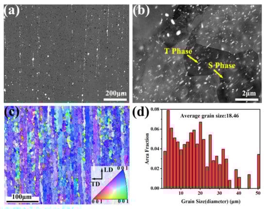 However, large, irregular, and inhomogeneous component phases (especially insoluble component phases containing impurities such as Fe and Si) often become the source of crack initiation and corrosion, and may promote crack propagation, thereby affecting the performance of the components [12]. In addition, a large number of rod-shaped T phases (Al20Cu2Mn3) [14] with sizes below 1 μm can be clearly observed from the higher multiples BSE diagram. The T-phase particles in the 2A12 aluminum alloy precipitate in the process of the homogenization heat treatment, and gradually grow up with the extension of the homogenization time. These particles are very stable in the subsequent solid solution and aging heat treatment process, and their main effect is to prevent grain boundary slippage, and to play the role of high-temperature strengthening during the high-temperature heat treatment or deformation heat treatment. The large-sized second-phase particles usually belong to the brittle phase, and its deformation ability for the coordination of the Al matrix is poor. When the particles have irregular shapes, large sizes, and an inhomogeneous distribution, especially, they are often broken during the deformation.