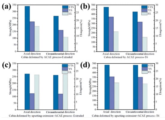 Figure 10 shows the average mechanical properties of the directly ACAE-forming cabin and the UE + ACAE-forming cabin. Axial-direction and circumferential-direction samples were used to test the mechanical properties of Cabin Zone Ⅴ, according to the extrusion state and the T6 state, respectively, and the results are shown in Figure 10.