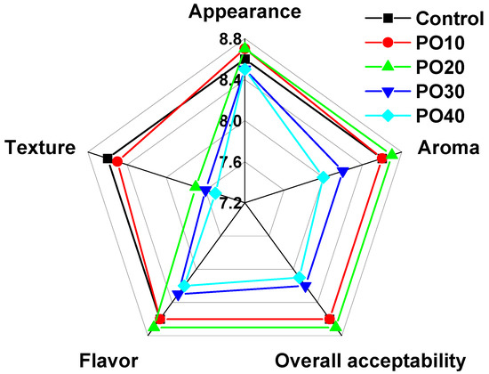 The sensory evaluation results of each group are shown in Figure 1. The appearance of all groups had excellent performance (>8). In the PO10 and PO20 groups, an appropriate increase in brightness of the sausages might be more loved by the group members. For the PO30 and PO40 groups, the decrease in the redness might reduce group acceptance of the sausages in appearance. In terms of aroma and flavor, all scores exceeded eight and PO20 had the best aroma and flavor. This might be because PO was rich in free amino acids, especially glutamic and aspartic, which were conducive to enhance the aroma and flavor of the sausage. The texture of the sausages decreased with the increase in PO content. This result might be caused by the soft texture of the sausage and more gaps inside the sausages (Section 3.2.) which were disliked by the group member. Although a difference was found between each group, all of these samples were judged as acceptable (>7), suggesting that PO had an opportunity to in sausages. From what has been discussed above, PO20 can be regarded as the best group in sensory evaluation through comprehensive consideration.