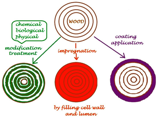 However, modification of the properties usually means the alteration of the chemical composition of the wood after preliminary processing [22,23]. Hill [17] classifies modifications into two groups. According to him, there is passive modification or impregnation, where the chemistry of the material does not change considerably, and active modification (chemical, thermal, and/or enzymatic) which alters the chemical nature of wood.