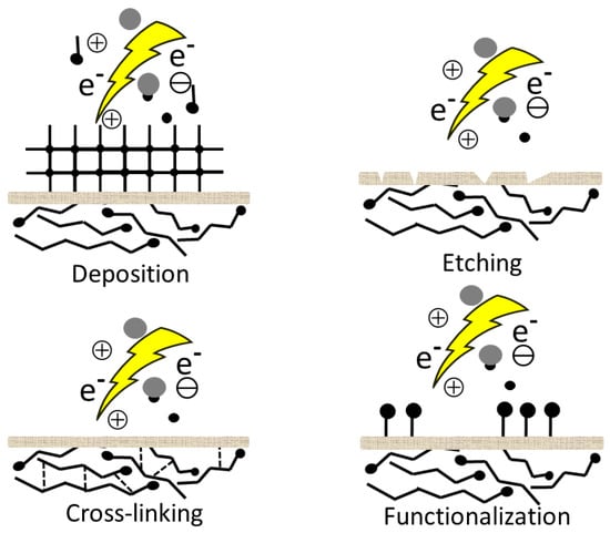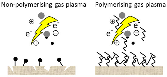 During plasma treatment, a number of processes takes place on the surfaces. These processes are highly dependent on the selected gas, the operating parameters and reactor design. Nevertheless, plasma–surface interactions are quite complex and not well understood [87]. We present the current scientific knowledge with the details needed to understand this article. In general, the interaction between plasma and surface can be divided into two different types [88]. One of them is when plasma is generated from non-polymerizing gases (e.g., N2, O2, Ar, air, and NH3) and the major effect can be surface cleaning, etching, cross-linking, or formation of new functional groups and radicals simultaneously, because of the reactive particles in the plasma [89,90] (Figure 3).