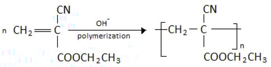A common monomer of this class of polymers is ethyl 2-cyanoacryalate [CH2=C(CN)COOC2H5], a colourless liquid with low viscosity and a slight odour in its pure form, and which is soluble in organic solvents. The polymerization process of cyanoacrylate adhesives occurs through anionic polymerization, producing addition polymers (the free-radical mechanism is also applicable, but the anionic one is easier to initiate). Highly electrophilic monomers, such as cyanoacrylates, require only weak nucleophile initiators (as H+ donors, strong bases are not strong enough for initiation). The presence of moisture [16] acts as an initiation source, since OH− is sufficient, while excessive moisture does not promote or harden the polymer. In anionic polymerization, initiation is normally very fast relative to propagation and all chains grow simultaneously. This leads to polymers with low polydispersity (or monodispersity) because the rate of inter-conversion between the different formulations is much faster than the polymerization [19]. Figure 1 shows in brief the polymerization reaction of ethyl 2-cyanoacryalate. In general, the curing conditions of cyanoacrylates, such as temperature, pH, and primers or impurities, determine the structure and properties of the final polymer. For example, in acidic conditions, no large molecular weights (MW) are observed at either 0 or 60 °C, while at neutral pH and 25 °C, the result is only polymers with high MW. Progress continues until the monomer is completely consumed or chain transfer or impurity termination occurs. Usually, some weak carboxylic acids, such as malonic, formic, oxalic, or cyanoacetic acid, are mentioned as terminators [20], and are formed by the hydrolysis of the monomer or have been formed and remained in various stages of production. Although water is the most common initiator for a cyanoacrylate adhesive, it is accepted that if the packaging contains up to thousands of ppm of water molecules, it causes the hydrolysis of monomers in combination with the presence of strong acid stabilizers [21,22].