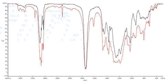 IR spectra of the adhesive before (t = 0, red line) and after t = 6 h (black line) of polymerization.