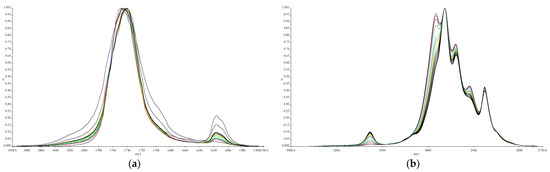 The cyanoacrylate adhesive is polymerised by anionic polymerisation, using water as a mild nucleophilic medium, due to its ability to attract e− from C of –COOR and –CN groups [26]. In most cases, the humidity of the atmosphere or the humidity adsorbed on the bonding surface is sufficient for the polymerization to begin within a few minutes. Specific peaks should be selected to better illustrate the polymerization progress. There are several options, depending on the chemistry of the macromolecule and on the experimental/operational tactic. In Figure 3, two summary spectral fragments show the peaks’ changes over time, for a period of 6 h of curing, in region 1950–1500 cm−1 (a) and 3300–2750 cm−1 (b). The stability of the peaks at 1750 and 2957 cm−1, correspondingly, and the gradual increase/decrease in the size of the neighbouring peaks is impressive, indicative of the careful operation during the experiments [27]. The large peaks work as internal standards for the credibility of the procedure, while the changing smaller peaks at 1617 and 3124 cm−1 describe the phenomenon.