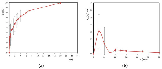 DC% over time for the 1st day of curing (a) and rate of DC% increase for the 1st hour of curing (b).