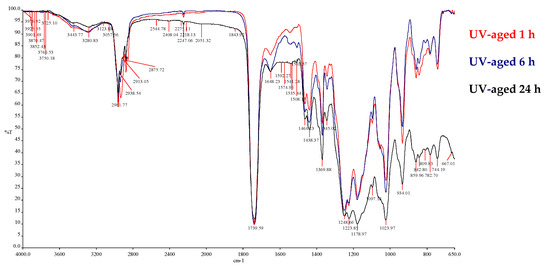 Moving on to the second part of the study, the effect of UVC irradiation on the samples is seen in Figure 5, where the spectra are presented in full. During the ageing process, any molecular change caused by photodegradation was observed via the FT-IR, while the colour changes via reflectance spectrometry. More specifically, the spectra are taken in that case by ATR spectroscopy at selected photo-oxidation times, because neither the films’ thickness (~7 mm) nor the surfaces of the worn films allow the transmission mode to be in IR. By comparing the spectra in Figure 5 for three time-intervals of exposure, it has been observed that changes occur in both the intensity/width of the peaks and the baseline quality in the fingerprint area.