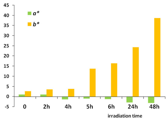 As photo-oxidation progresses, it is observed that the coordinates L*, indicating the lightness of the sample, and a*, indicating the position of the colour over the green–red axis, decline slightly in the first few hours and more so after 24 h of irradiation. On the other hand, the coordinate b*, indicating the position of the colour over the yellow–blue axis, rises significantly, a fact also obvious to the naked eye. Thus, the colour differences calculated by Equation (1) for ΔΕ* follow a rising trend, reaching 25 after 6 h of explosion and 45 after 2 days under 254 nm. Table 2 also shows that the chroma coordinate C* (or saturation) becomes slightly lower as the exposure time increases, indicating that treated samples are becoming gently duller and less clear due to the resulting yellowing and intermolecular changes. The a* values show small variations towards the green shade, confirming that the main colour change is on the yellow scale, as the big change of the b* values of the treated samples is definite (Figure 6). As for h° (hue angle), 90° is the usual value for yellow samples; indeed, the values are around 90°, with an increasing trend (the theory indicates h + b* over yellowing). The L* values are high, as one would expect from bright, yellowish samples, and remain high with small fluctuations until 5 h of irradiation.