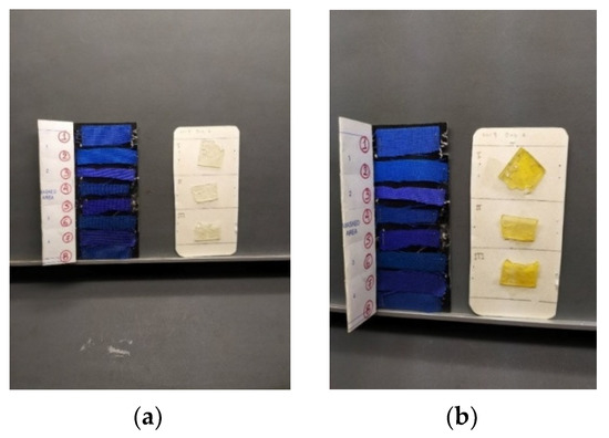 In this experimental part, 8 strips of blue wool control fabric were placed fixed on an opaque cardboard “half-masked”, numbered as 1–8 (very low to very high light fastness, dimensions 1 cm × 6 cm). The woollen standards used were supplied by James H. Head Co., Ltd., Calderdale, UK (batch No. 000932). Blue wool standards were introduced along with the samples in the ageing device. The observation was conducted under standard conditions, in an observation chamber (Mulder’s VeriVide®), with the application of a D65 lamp, which mimics the average natural daylight, and anN lamp indicating the artificial light.