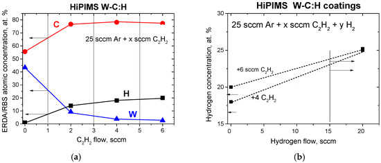 Similar estimates in Figure 2b imply that the addition of 15 sccm hydrogen into Ar + C2H2 atmospheres may increase its total concentrations in the coatings only by around 5 at.%. Thus, the maximum levels of carbon hydrogenation in the matrix in the case of 5 sccm C2H2 + 15 sccm H2 additions could be up to around 30%. The ratio between carbon and tungsten concentrations also suggests that, up to 2 sccm C2H2, the dominant phase in the coating would be tungsten carbide, whereas, at >2 sccm C2H2, coatings with dominant hydrogenated carbon phase were obtained. It somehow agrees with the abovementioned transition from a nanocrystalline to amorphous structure.