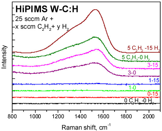 Qualitative comparison of Raman spectra in the studied HiPIMS W-C:H coatings in dependence on the amount of acetylene and hydrogen additions into Ar sputtering atmosphere during hybrid PVD–PECVD process. The shortened abbreviation at the individual coatings corresponds to the flows of C2H2 and H2 in the sputtering atmosphere during deposition.