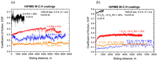 Friction curves obtained in humid air in the studied W-C:H coatings deposited with different flows of (a) C2H2 and (b) C2H2 + 15 sccm H2. The abbreviations at the individual curves refer to the flows of C2H2 and H2 in the sputtering atmosphere during deposition.