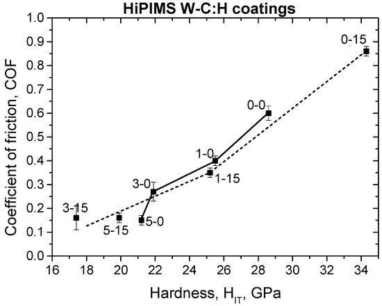 Tribological behavior, including friction and wear, exhibit similar and even more complex dependences. The coefficients of friction (COFs) of W-C(:H) coatings primarily depend on the coating structure, which is defined by the relative amount of (hydrogenated) carbon content, as well as on the structure of carbon itself and the test conditions involving load, material of the tribopair, their surface roughness values and even the test environment [1,2,3,4,5,9,10,23,24,25,26,27].