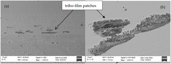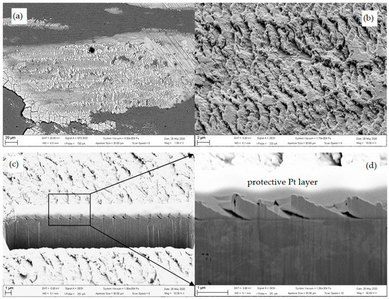 The small peaks below 700 cm−1 were identified as various tungsten and iron oxides. Finally, the wide band was attributed to second-order peaks of carbon and, possibly, also to the vibrations from trans-polyacetylene –(CH)x groups, which may occur at 2850–2960 cm−1. This assumption was supported by the necessity of two additional peaks required for proper fitting of D and G carbon peaks at 1150 and 1440 cm−1 which also correspond to trans-polyacetylenes [43]. Thus, tribo-film patches in non-hydrogenated W-C coating consisted of a mixture of disordered (hydrogenated) graphitic carbon, ferritungstate and small amounts of iron oxides and tungsten oxides. The patches in slightly hydrogenated coating (0C2H2-0H2) shown in Figure 8b were very similar, but Figure 10a shows that they exhibited relatively regular wavy surface relief. The image in Figure 10b at higher magnification implied it consists of tile-like fragments tilted in one direction. The cross-section in this area by FIB (Figure 10c,d) revealed that the “tiles” were formed via periodic fracture of the transfer layer and their partial delamination and tilting against the direction of the friction movement. The thickness of the patch was around 25 nm, and the period between the tips of the neighboring tiles (fragments) was around 1630–1770 nm. The existence of such specific structures of the patches implies that smearing due to shear forces has to be present to generate tensile stresses causing through-thickness cracking and subsequent delamination. It could simultaneously show the early stage of patch destruction, resulting in their absence in the case of long-distance tests. The above results indicate that tribo-film patches are temporary. They indicate the presence of high local shear stresses, but they cover only a small fraction of the wear track surface. Thus, despite being an essential part of the early stages of friction, their presence cannot control the long-term friction behavior of the studied W-C:H coatings.