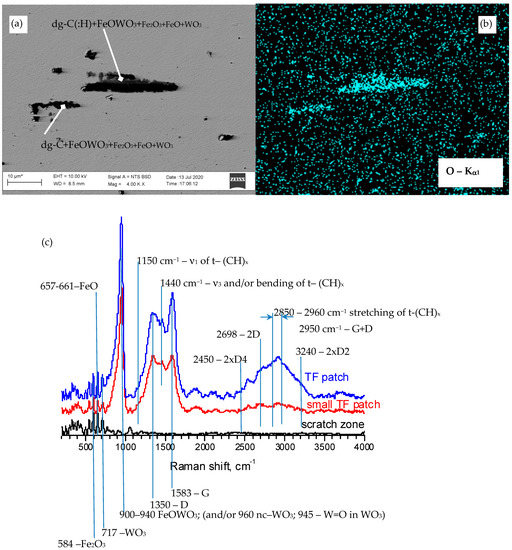 The EDS mapping of the patches in W-C 0C2H2-0H2 coating revealed an excessive amount of oxygen (Figure 9a,b), besides tungsten and carbon [25,26]. The presence of W, C and Fe was also confirmed, but the quantification of their concentrations was strongly affected by the underlying W-C:H coating. Raman spectroscopy in different patches (Figure 9c) revealed strong peaks at 940, 1350 and 1580 cm−1 and small peaks below 700 cm−1, as well as a wide band in the 2500–3500 cm−1 range. The most intensive peak at 940 cm−1 was assigned to ferritungstate, FeOxWO3 [40] (though the contribution from nanocrystalline WO3 cannot be excluded). The peaks at 1350 and 1580 cm−1 corresponded to the well-known D and G peaks of disordered graphitic carbon (dg-C) [41,42]. They are direct evidence of “graphitization”, i.e., the formation of amorphous carbon during friction [35].