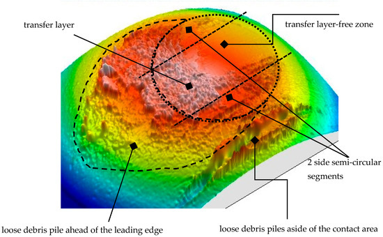 Similar to what was shown in many other studies [1,6,7,9,10,11,12,23,24,28], the wear scars in the W-C coating consist of a transfer layer on the circular contact area of the worn ball cap, which was surrounded by debris piles (Figure 11). The debris formed two loose parallel piles aside and along the contact area diameter and a denser wedge- or semi-circular- shaped pile with variable thickness ahead of the leading edge of the contact area. The contact area was covered by a transfer layer with variable thickness—it was the thickest in the central zone adjacent to central scratch zone in the wear track, and it thinned, or even disappeared, in a zone closer to the trailing edge and in both side semi-circular segments.