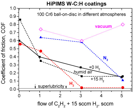 Effect of different atmospheres on the coefficient of friction in the W-C:H coatings deposited with variable amounts of C2H2 + 15 sccm H2. The dependence for the coating deposited without hydrogen (full line with + 0 H2 marking) was added for comparison.