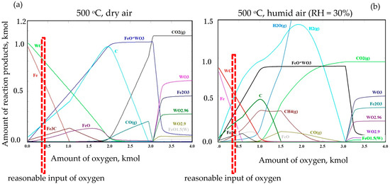 The effect of humidity on the results of modeling in air can be evaluated from the comparison of the calculations in Figure 19 which show the possible reaction products as a function of the amount of oxygen in dry and humid air, respectively. The input composition corresponds to the direct contact of a steel ball with a W-C coating.