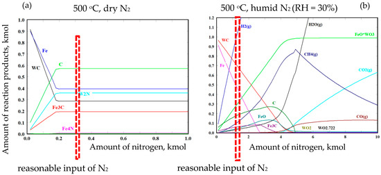 Analogous modeling of the reaction products in WC + 5% C + Fe system at 500 °C in (a)—dry nitrogen (reprinted with permission from Ref. [27], 2022, Elsevier) and (b) humid (RH = 30%) nitrogen. Vertical frame indicates the amount of nitrogen when the compositions similar as in the experiment can be obtained.