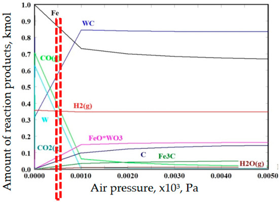 Modeling of the reaction products in WC + 5% C + Fe system at 500 °C in low vacuum obtained by using humid air and its gradual pressure reduction. The low vacuum conditions seem to be obtained at pressure below 100 Pa (1 × 10−3 bar) (reprinted with permission from Ref. [27], 2022, Elsevier). Similar to all previous cases, the vertical frame indicates the conditions generating reaction products identified by Raman spectroscopy in transfer layer.