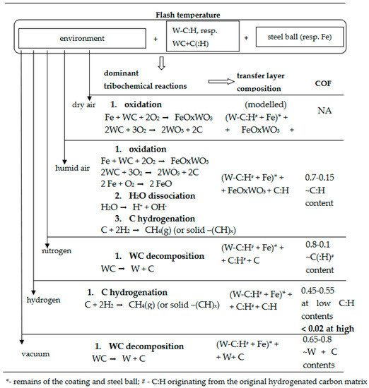 To understand the extensive results obtained for coatings with different compositions and under different conditions, a classification of principal observations is necessary. Possibly the most important observations in that sense are that the transfer layers formed in each environment, and they were always attached to the steel ball (thin film patches in the wear tracks (see Figure 8, Figure 9 and Figure 10) are essential for the understanding of the local reactions among asperities, but they do not control macroscopic friction and, therefore, can be omitted). The first consequence is that the mechano(tribo)chemical reactions producing transfer layers should be a common feature for the friction among materials subjected to mutual reactions and/or to the reactions with the environment (when the adhesion of the reaction products to the ball or coating is sufficiently high). The second principal consequence of the existence of transfer layers is that the final COFs would always be controlled by shear interactions between the coating surface and transfer layer. Subsequently, the variations of COF values depending on the coating composition and environment could be explained by the variations in the composition of the corresponding transfer layers. Obviously, the modifications of the structure of the wear track, indicated by an increase of the hardness and indentation modulus, especially in its central part (see Section 3.2.2), may also be involved, but the focus of the current study remains on transfer layers. The results from direct experimental observations and modeling were therefore summarized in the schematic in Figure 23 to easier visualize the dominant mechano(tribo)chemical reactions as the correlations among transfer layer composition and corresponding COF. This overview shows the differences among dominant reactions concerned mostly with WC oxidation or decomposition and suggests that the amount of lubricating carbon, (or its ratio to the amount of ferritungstate) in the transfer layer, determined the COF values in humid air, nitrogen and vacuum. However, the lowest COFs obtained in the hydrogen atmosphere without oxidation imply that not only the amount of carbon but also the level of its hydrogenation may be crucial. The difficulty is that it is not possible to distinguish among hydrogenated carbon in the matrix of the as-deposited material (marked in Figure 23 as C:H#) and carbon produced by WC decomposition and hydrogenated via interaction with the surrounding H2 atmosphere (marked C:H). ERDA measurements of hydrogen concentrations in the transfer layer are also not feasible; therefore, only theoretical considerations are possible.