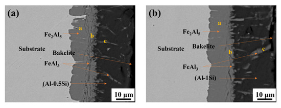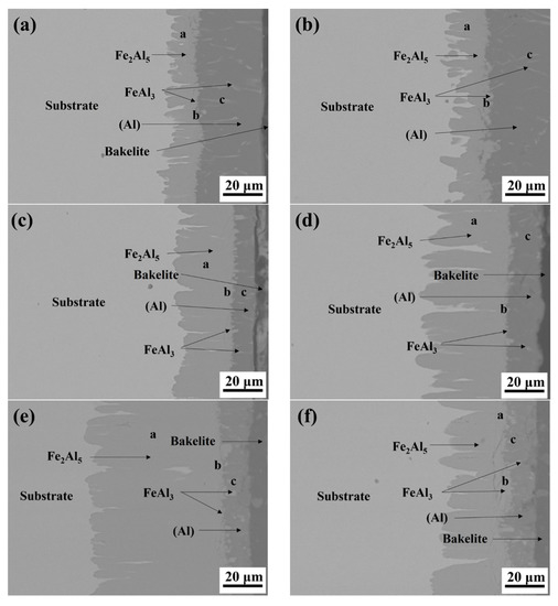 Figure 1 shows the cross-sectional microstructure of Q345 steel hot-dipped in aluminum solution at 700, 750, and 800 °C for 30 s and 3 min, respectively. It can be seen that the cross-sectional structure of the coating was divided into three different areas: external aluminum layer, intermetallic compound layer, and matrix steel. Composition of the intermetallic layer determined by EDS are listed in Table 2. The representative positions of the components of each phase determined in Figure 1 are marked with symbols a, b, c, respectively. In fact, the composition of each phase was the average of the components at five similar positions. According to the EDS results and combined with the Fe-Al phase diagram, the intermetallic compound layer consisted of two sublayers: the inner part at the metal-coating interface was the Fe2Al5 phase, and the composition determined by EDS point analyses was 70.9–71.9 at.% Al, 27.9–28.8 at.% Fe, and ≤0.6 at.% Mn. The outer part was the FeAl3 phase, and the composition found by EDS point analyses was 75.6–75.9 at.% Al, 23.8–24.1 at.% Fe, and 0.3 at.% Mn. The Fe2Al5 phase was formed by reactive diffusion of iron atoms and aluminum atoms at the interface during hot dipping [4,6]. There was an irregular interface between the alloy layer and the steel matrix, which was in a tongue shape [9,10]. However, the FeAl3-phase layer was not so obvious until the hot-dipping temperature increased to 800 °C. In addition, it could be found that there was also a small amount of discrete-phase precipitation in the external aluminum layer. According to EDS analysis, this discrete phase was the FeAl3 phase, which was precipitated through eutectic reaction in the solidification structure as the cooling speed was not quick enough while taking out the sample from the hot-dipping bath. Because the precipitated FeAl3 phase was relatively small, the average Al content measured by EDS was relative higher than that in the FeAl3 sublayer.
