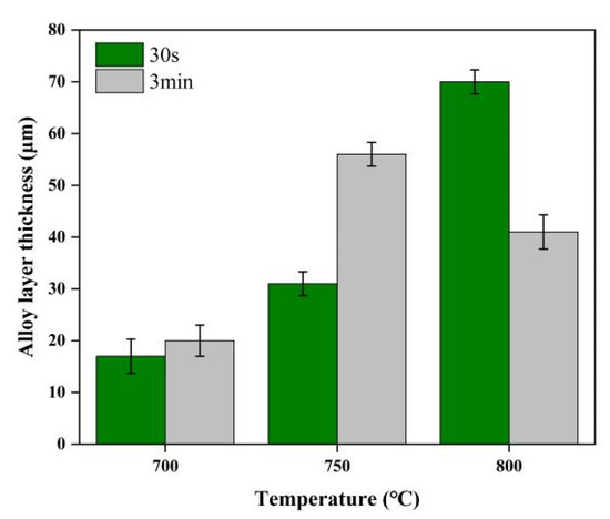 The intermetallic layer thickness of Q345 steel hot-dipped in pure aluminum solution at 700, 750, and 800 °C for 30 s and 3 min is shown in Figure 2. Comparing Figure 1a,b, it can be found that when the hot-dip temperature was 700 °C, the external pure aluminum layer was relatively thick, while the Fe2Al5 phase area was relatively thin. The reason for this obvious difference was that at this temperature, the thermal diffusion was relatively slow and the fluidity of the aluminum solution was poor, resulting in a considerable part of thick pure aluminum layer still adhering to the sample when the sample was taken out after hot dipping. At the same time, it can be found that when the hot-dip temperature was 700 °C, the type and thickness of the intermetallic layer did not change significantly with the extension of hot-dip time. When the dipping time was extended from 30 s to 3 min, the thickness of the intermetallic layer increased from 17 to 20 μm.