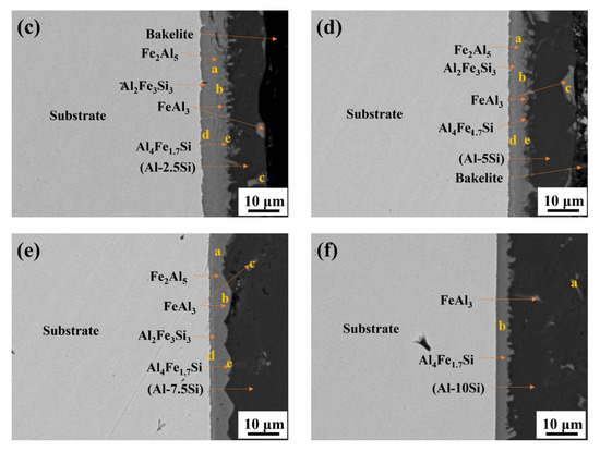 Since Q345 steel had a moderate, flat, and uniform diffusion layer after hot dipping in pure aluminum at 750 °C for 30 s, so the temperature of hot dipping aluminum-silicon was also set to be 750 °C and the dipping time was 30 s. Figure 3 shows the cross-sectional microstructure of Q345 steel hot-dipped in different Al-Si molten pools. Phase analysis by EDS in Figure 3 is listed in Table 3. Similarly, the typical positions (a, b, c…) used to determine the composition of each phase were also added. It should be noted that the compositions of two ternary phases (Al2Fe3Si3 and Al4Fe1.7Si) in Figure 3 are not listed in Table 3. This is mainly because their size was too small to be analyzed by EDS. These two phases were inferred by combining the phase diagram and literature, which will be discussed in detail later. Figure 4 shows the relationship between the thickness of the intermetallic layer and the silicon content. When the Si content was 0.5 at.%, the thickness of the alloy layer was about 19 μm. When the Si content was increased to 10 at.%, the thickness of the alloy layer was reduced to about 7 μm. It is also found that when the Si content was 0.5 at.%, the interface between the alloy layer and the matrix was still in a classic tongue shape, but when the Si content was increased to 2.5 at.% or above, the interface between the alloy layer and the matrix gradually changed from tongue-like to flat. These observations indicated that the Si addition in pure Al reduced the growth rate of the intermetallic layer and changed its morphology.