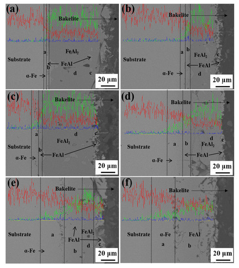 Figure 5d shows the cross-sectional microstructure of Q345 steel after being hot-dipped in Al-2.5Si solution and annealed at 900 °C for 1 h. According to the EDS analysis and its corresponding line profiles of elements Fe, Al, and Si distributions across the coating layer on the steel substrate, the outermost layer was the FeAl2 phase, inwardly followed by the FeAl phase, the α-Fe phase, and the matrix. In Figure 5e, the outermost layer was the FeAl phase, inwardly followed by the FeAl2 phase, the FeAl phase, the α-Fe phase, and the matrix. In Figure 5f, the FeAl2 phase disappeared and all of them were transformed into the FeAl phase. By analyzing the experimental results in Figure 5, it is known that in order to transform the brittle Fe2Al5 phase in the coating into the FeAl phase with better toughness, it is better to anneal the coating at 900 °C for 3 h.