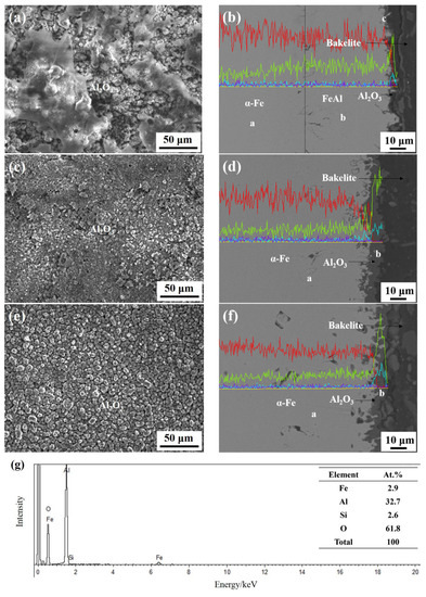 Figure 6 shows the surface morphology and cross-sectional microstructure of these three groups of samples after oxidation and the corresponding EDS line profiles of elements Fe (red line), Al (green line), O (blue line), and Si (purple line) distributions across the coating layer on the steel substrate. Compositions of each phase are listed in Table 5. In Figure 5a–c were typical positions used to determine the composition of each phase.