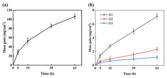 Relationship of weight gain of Q345 steel with oxidation time: (a) pure Q345 steel; (b) D1, D2, and D3 samples prepared by hot dipping and annealing.