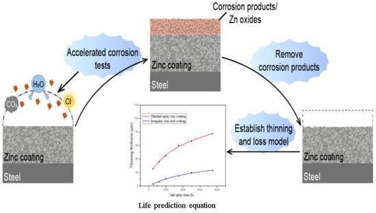 The industry has recognized that the service life of the coating depends on the thickness of the zinc layer and the dissolution rate of zinc, i.e., the oxidation rate of the zinc coating. The effect of inorganic zinc-rich coating remains unchanged, i.e., the metal components are prevented from being corroded through zinc oxidation for the sacrificial anode. Considering that coating failure affects the safety of the equipment, as well as the structures and the normal operation of the system, it is necessary to demonstrate and analyze the service life and microstructure of the coating during the corrosion process so as to offer guidance on the development and selection of engineering coatings. The homogeneous corrosion rate and microstructure characteristics of the zinc coating are important parameters for service-life evaluation and can be used to provide critical support for the maintenance of steel structures, as well as the rapid selection and design of coating formulations []. Minliang Pan conducted a reliability evaluation of the oxidation failure model of the spherical interface thermal barrier coating. By establishing the oxidation failure model of thermal barrier coating, and calculating the sensitivity factor using mathematical theory, it was concluded that the thickness, interface morphology radius, and thermal expansion coefficient difference were the key factors affecting coating failure, and the interaction of these factors determined the coating service life []. Xiaoqiang Liu et al. conducted a reliability evaluation on the aging problem of inorganic zinc (IOZ) coating applied to the containment of passive nuclear power plants. After a reliability demonstration and analysis, it was concluded that, in order to ensure the safe use of the coating during normal service life, attention must be paid to the construction of the coating and it must be supervised during the actual production, to ensure that the quality and performance of the coating meet the requirements of production and use []. Nicard elaborated on the effect of Zn and Mg alloying on microstructures and the anticorrosion mechanisms of Al-Si based coatings for high-strength steel []. Timashev proposed the Markov approach to early diagnostics, reliability assessment, the residual life, and the optimal maintenance of pipeline systems []. There are relatively few studies on coating reliability evaluation, and there is insufficient attention paid to the related research fields. However, like coating life prediction, coating reliability evaluation is related to the safe use of coatings during service, and greater attention must be paid to it.