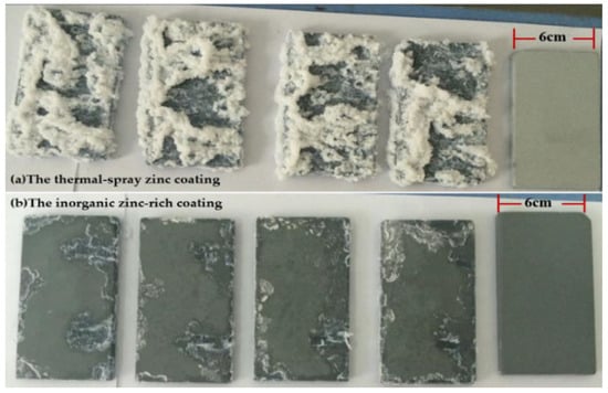 As can be seen in Figure 3, after the salt-spray test and the removal of the corrosion products from the surface, corrosion stains appeared on the surface of the thermal-spray zinc coating, which was whitened; meanwhile, there were basically no changes to the surface of the inorganic zinc-rich coating, whose color remained unchanged. The surface of the two zinc coatings was free of defects such as bubbles, cracks, rust, etc., and the coating samples were intact, meeting the requirements of coating reliability.