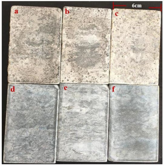 Appearance of the coating after removal of corrosion products after salt spray (3500/5000/7500 h from left to right, respectively): (a–c) the thermal-spray zinc coating; (d–f) inorganic zinc-rich coating.