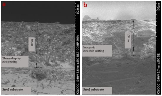 Analysis of the cross-sectional microstructure of the zinc coating: (a) thermal-spray zinc coating and (b) inorganic zinc-rich coating.