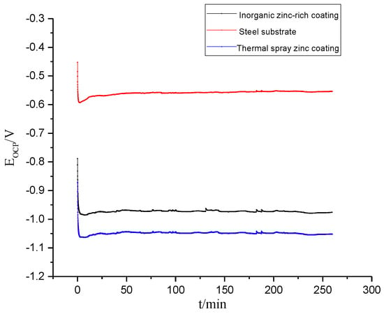 Figure 5 shows that the open circuit potential of steel substrate is −0.563 V (vs. SCE), and that of the thermal-spray zinc and inorganic zinc-rich coating are −1.078 V (vs. SCE) and −0.971 V (vs. SCE). The corrosion potentials of the two kinds of coatings are much lower than the open circuit potential of the substrate, which could provide cathodic protection for the substrate. The comparison of the two kinds of zinc coatings shows that the open circuit potential of inorganic zinc-rich coating is higher than that of the thermal-spray zinc coating. From the perspective of corrosion tendency, the thermal-spray zinc coating is more likely to corrode. Due to the addition of polymer materials, the conductivity of inorganic zinc-rich coating is poor; thus, corrosion does not occur so easily [,], and plays an anti-corrosion role under the function of providing cathodic protection. The data analysis of the open circuit potential provides a new idea for the formulation design of zinc coating. As for the role of cathode protection, it is necessary to coordinate the two important aspects of anode sacrifice and corrosion inhibition, so that the formula performance can be maximized.