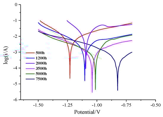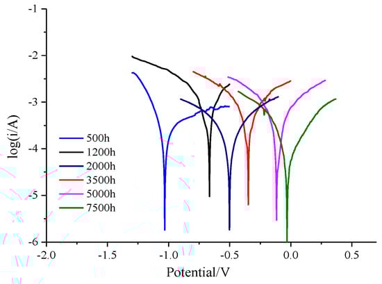 As shown by the data for corrosion current in Figure 6 and Table 1, at the initial salt-spray stage, the surface of the thermal-spray zinc coating is corroded evenly and the potential of the electrode is negative (−1.242 V vs. SCE); moreover, the corrosion dissolution rate is fast, with a corrosion current density of 1.69 × 10−3 A. After 1200 h of salt spray and the formation of corrosion products, the corrosion current decreases and the corrosion potential changes to −1.102 V (vs. SCE); however, the instability of the corrosion products causes the corrosion current data to be dispersed and to fluctuate within a certain range. Generally speaking, with the extension of salt-spray time, the corrosion potential of the thermal-spray zinc coating gradually moves forward, the dissolution rate of the zinc coating shows a downward trend, and the corrosion current gradually decreases. The possible reason is that after the zinc dissolves, new corrosion products are generated to cover the surface of the thermal-sprayed zinc, preventing further corrosion and dissolution of the zinc inside the coating. Finally, after 7500 h of salt spray, the corrosion potential increases to −0.824 V (vs. SCE) and the corrosion current decreases to 1.32 × 10−4 A [].