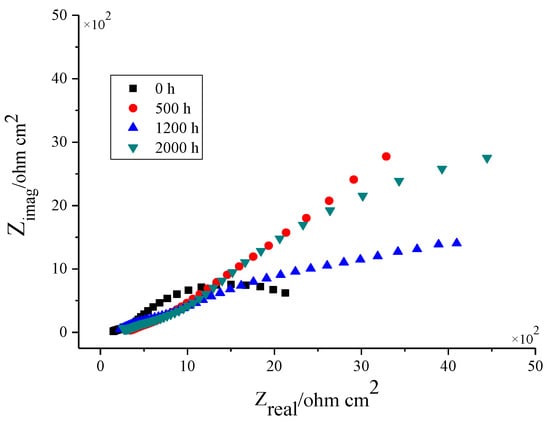 Nyquist charts of the thermal-spray zinc coating after being salt sprayed for 0–2000 h.