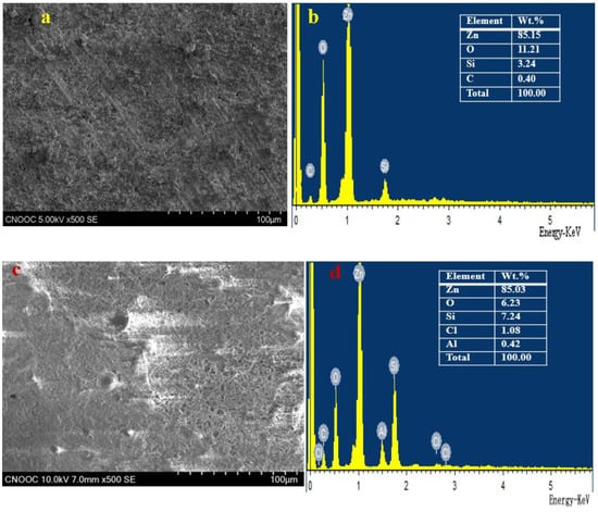 Analysis of the surface microstructure of the inorganic zinc-rich coating: (a,b) SEM photograph and EDS pattern of inorganic zinc-rich coating without salt spray; (c,d) SEM photograph and EDS pattern of inorganic zinc-rich coating after salt spraying for 7500 h.