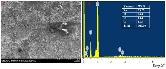 Analysis of the surface microstructure of the thermal-spray zinc coating: (a,b) SEM photograph and EDS pattern of thermal-spray zinc coating without salt spray; (c,d) SEM photograph and EDS pattern of thermal-spray zinc coating after salt spraying for 7500 h.