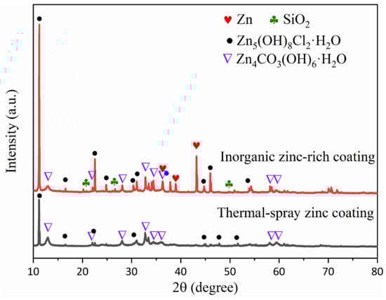 To further analyze the change in the material structure on the coating surface before and after salt-spray treatment, the substance composition of the two coatings before and after corrosion was analyzed. Figure 14 shows XRD spectra of the untreated surfaces of the thermal-spray zinc and inorganic zinc-rich coatings. According to the results of a comparison with the PDF Database, the composition and the approximate content ratio of the substances on the coating surface are confirmed. Pure zinc and zinc oxide are identified on the surface of thermal-spray zinc coating, with the approximate content ratio of the two substances being as follows: pure zinc: zinc oxide = 95:5. Pure zinc, zinc oxide and quartz are identified on the surface of the inorganic zinc-rich coating, with the approximate content ratio of the two substances being as follows: pure zinc: zinc oxide: quartz = 90:5:5. The inorganic zinc-rich coating sample also contains a small number of impurities (Zn5(OH)8Cl2·H2O, Zn4CO3(OH)6·H2O, etc.). This is because the inorganic zinc-rich coating can react with the water and CO2 in the air, generating a new chemical compound or complex during its own solidification [,].