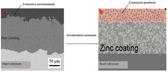 Schematic representation of the basis for obtaining the coating life equation. (a) The cross- section of the zinc coating; (b) Cross-sectional view of corrosion products formed by zinc coating.
