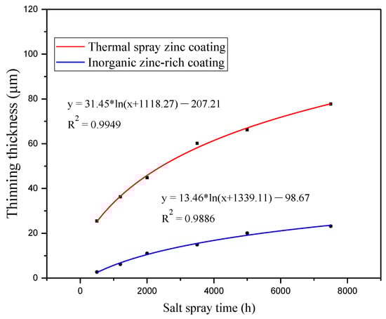 Considering that the two coatings have a similar corrosion protection mechanism [,,,,], it is the difference in their composition and structure that causes a difference in the corrosion rate. Although the previous SEM and electrochemical analysis showed that the inorganic zinc-rich coating has higher corrosion resistance, more detailed data are required for the prediction of its service life. After 7500 h of salt-spray testing, the thinning rate of the two coating samples was compared. Additionally, the sets of data were fitted, deriving corrosion rate equations for the two coatings.