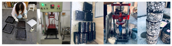 Preparation of the hot-mix asphalt used an automatic mixture device. The homogenous asphalt mixture was placed in a mold (300 mm × 300 mm × 50 mm). Then, compaction was carried out so as to form the bottom slab. When the bottom asphalt slab cooled to approx. 25 °C, a tack coat was applied on the surface using a bristle brush before the installation of the geogrid. After the tack coat break, a second layer of hot-mix asphalt was placed and compacted over the geogrid. During the whole preparation process, the mixing temperature of aggregate was not lower than 170 °C, and the tack coat was be painted at 0.5 L/m2. Four core samples were extracted from the double-layered asphalt slab. Every core sample was 100 mm in diameter and 100 mm thick, with both lower and upper layers being 50 mm thick. The preparation of the test specimen is presented in Figure 2. Tack coat properties are presented in Table 3.